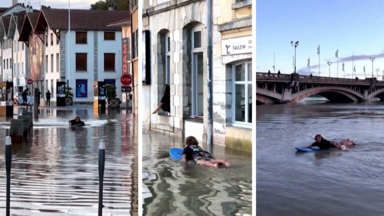 Βίντεο από την πλημμυρισμένη Μπαγιόν στη Γαλλία δείχνει έναν άνδρα πάνω σε σανίδα του σερφ να… κωπηλατεί περιδιαβάζοντας στους δρόμους την Παρασκευή, στον απόηχο των έντονων βροχοπτώσεων που έπληξαν τα νότια της χώρας και προκάλεσαν μεγάλες καταστροφές.