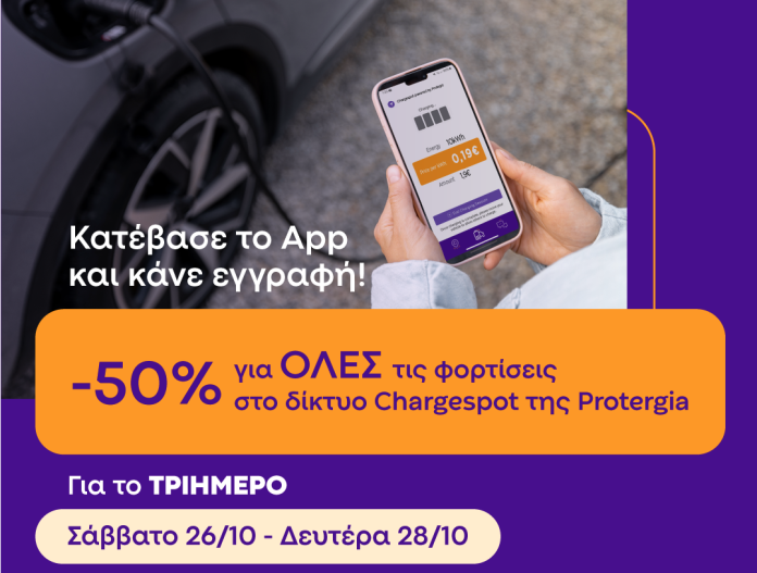 Από Σάββατο 26/10 έως και Δευτέρα 28/10 η Protergia προσφέρει έκπτωση 50% σε όλο το δίκτυο φορτιστών και ταχυφορτιστών στην Ελλάδα!