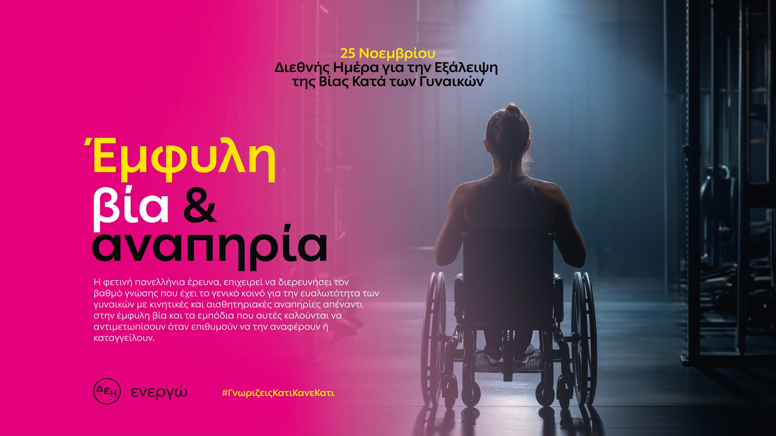 Φως στην αθέατη πραγματικότητα των θυμάτων έμφυλης βίας με αναπηρία, επιχειρεί να ρίξει η ΔΕΗ μέσα από την έρευνα «Έμφυλη βία και γυναίκες με κινητική και αισθητηριακή αναπηρία», με περισσότερα από 2 στα 5 άτομα να δηλώνουν ότι έχουν ακούσει για περιστατικό βίας απέναντι σε γυναίκα με αναπηρία. Για τέταρτη συνεχή χρονιά, η ΔΕΗ συμμετέχει ενεργά στον αγώνα για την εξάλειψη της έμφυλης βίας, αναλαμβάνοντας ουσιαστικές πρωτοβουλίες για την ενημέρωση και ευαισθητοποίηση του κοινωνικού συνόλου με στόχο την καταπολέμηση του φαινομένου.