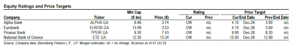 Παράλληλα, η JP Morgan επιβεβαίωσε τις θετικές συστάσεις (OW – Overweight) της — με προτίμηση προς τη Eurobank και την Εθνική Τράπεζα.