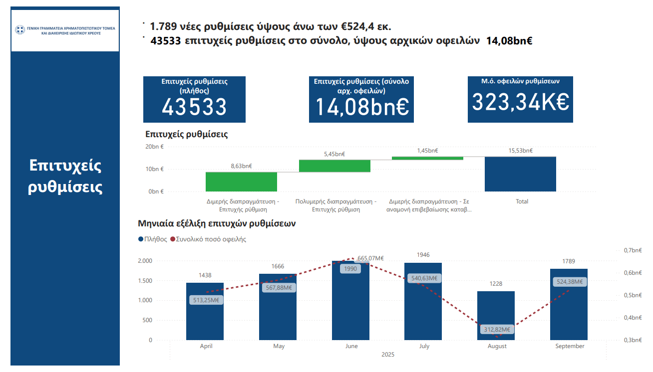 Συνολικά μέχρι τα τέλη Σεπτεμβρίου καταγράφονται 43.533 επιτυχείς ρυθμίσεις για αρχικές οφειλές ύψους 14,08 δισ. ευρώ που έχουν ρυθμιστεί μέσω του εξωδικαστικού μηχανισμού. Ταυτόχρονα, το ποσοστό εγκρισιμότητας έφτασε στο 79%.
