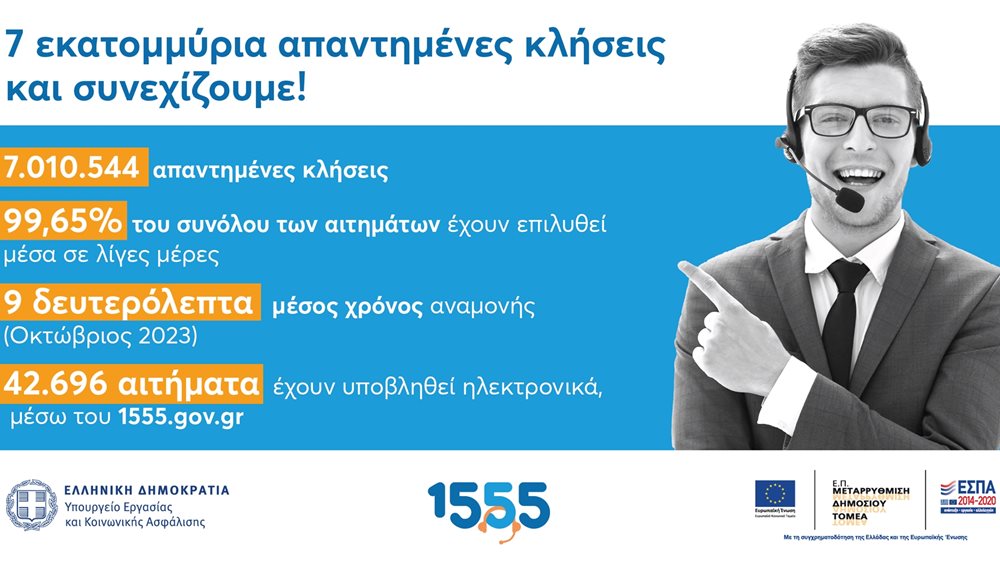 Περισσότερα από 7 εκατομμύρια κλήσεις έχει εξυπηρετήσει στους 27 μήνες λειτουργίας του το 1555, ο Ενιαίος Αριθμός Εξυπηρέτησης Πολιτών του Υπουργείου Εργασίας και Κοινωνικής Ασφάλισης.