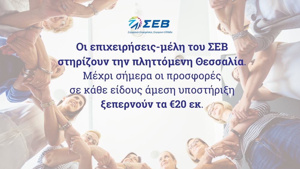 Οι δυναμικές επιχειρήσεις μέλη μας, στο πλαίσιο της κοινωνικής υπευθυνότητας, κινητοποιήθηκαν από την πρώτη στιγμή όταν οι καταστροφικές κακοκαιρίες Daniel και Elias χτύπησαν τη Θεσσαλία, πλήττοντας ανθρώπους, σπίτια, καλλιέργειες, υποδομές και επιχειρήσεις, με τη δέσμευση να συμβάλλουν στον εθνικό σκοπό της αποκατάστασης της περιοχής, τονίζει ο ΣΕΒ.