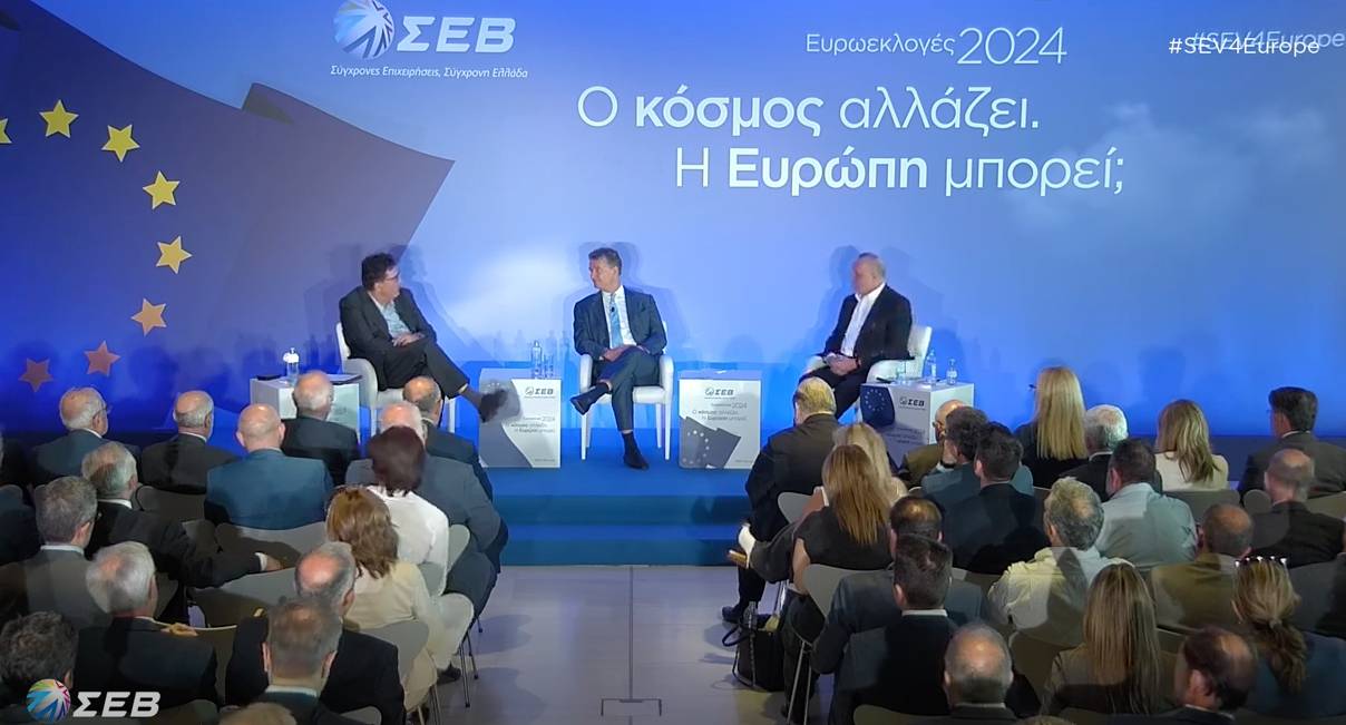 Στην εκδήλωση για το παρόν και το μέλλον της Ευρωπαϊκής Ένωσης, που διοργάνωσε ο ΣΕΒ ενόψει των Ευρωεκλογών 2024, συναντήθηκαν και συζήτησαν ο κ. Δημήτρης Παπαλεξόπουλος, Πρόεδρος ΔΣ ΣΕΒ, Αντιπρόεδρος ERT και ο κ. Ευάγγελος Μυτιληναίος, Αντιπρόεδρος ΔΣ ΣΕΒ, Πρόεδρος Eurometaux, με συντονιστή τον κ. Αλέξη Παπαχελά, Διευθυντή της εφημερίδας «ΚΑΘΗΜΕΡΙΝΗ». Στην εκδήλωση που είχε ως τίτλο: «Ευρωεκλογές 2024: Ο κόσμος αλλάζει. Η Ευρώπη μπορεί;» οι δυο θεσμικοί εκπρόσωποι της ελληνικής, αλλά και της ευρωπαϊκής επιχειρηματικότητας, συζήτησαν τις θέσεις και τις προτεραιότητες για την Ευρώπη του 2030 και σκιαγράφησαν τις προϋποθέσεις για μια ευρωπαϊκή επανεκκίνηση.