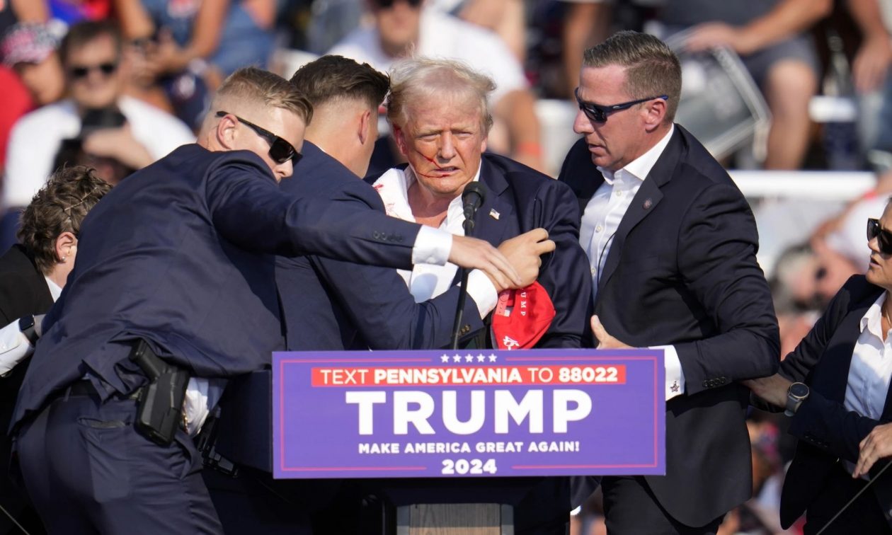 Τα μέλη της Μυστικής Υπηρεσίας στήνουν τον Τραμπ στα πόδια του. Το κόκκινο καπελάκι με το σύνθημα «Make America Great Again» του έχει πέσει, τρέχει αίμα από το αφτί του και έχει ματώσει το πρόσωπό του.